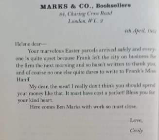 Your marvelous Easter parcels arrived safely and everyone is quite upset because Frank left the city on business for the firm the next morning and so hasn’t written to thank you, and of course no one else quite dares to write to Frank’s Miss Hanff.